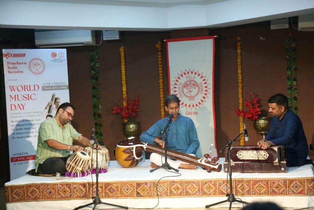 शहर की अग्रणी सांस्कृतिक संस्था प्राचीन कला केंद्र द्वारा आज यहाँ वर्ल्ड म्यूजिक डे के अवसर पर एक विशेष संगीतिक संध्या का आयोजन आज यहाँ केंद्र के एम एल कौसर सभागार में सायं 6 :00 बजे से किया गया। इस अवसर पर केंद्र में कार्यरत संगीत गुरुओं श्री प्रवेश कुमार , डॉ शिम्पी कश्यप , डॉ जसबीर सिंह एवं श्री सुरजीत सिंह द्वारा विभिन्न प्रस्तुतियां पेश की गयी।