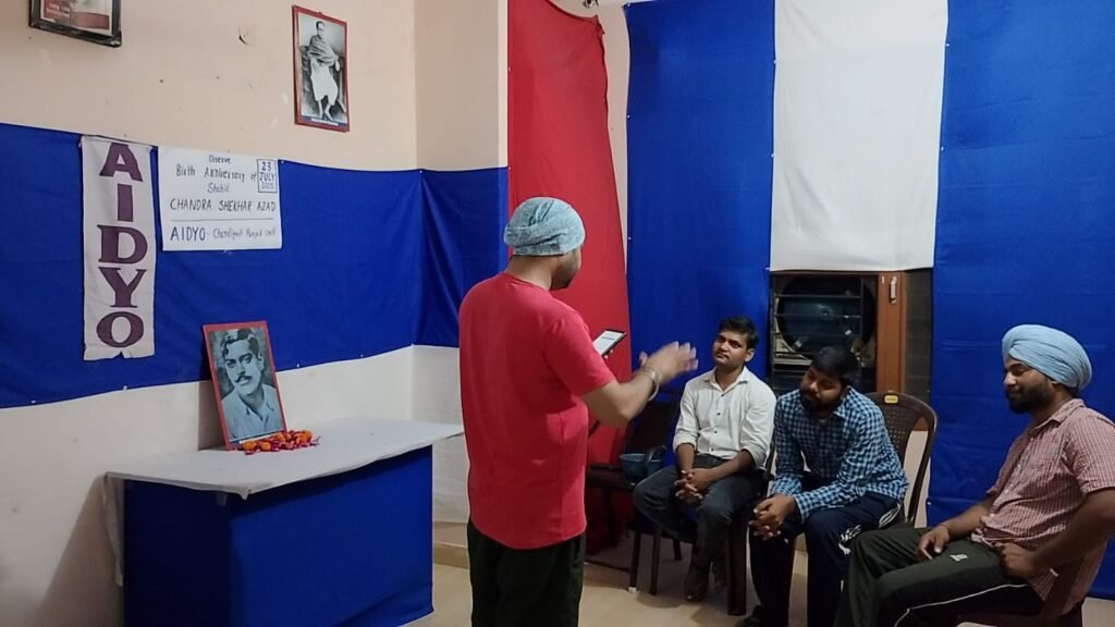 AIDYO चंडीगढ़-पंजाब यूनिट के सदस्य अखिलेश कुमार ने शहीद चंद्रशेखर आज़ाद के जीवन संघर्ष और मौजूदा परिस्थितियों में युवाओं का कर्तव्य, विषय पर बात रखी। सभा के अंत में मनिंदर सिंह सदस्य, AIDYO कुम्बड़ा लोकल यूनिट ने चंद्रशेखर आज़ाद पर स्वरचित कविता सुनाई।