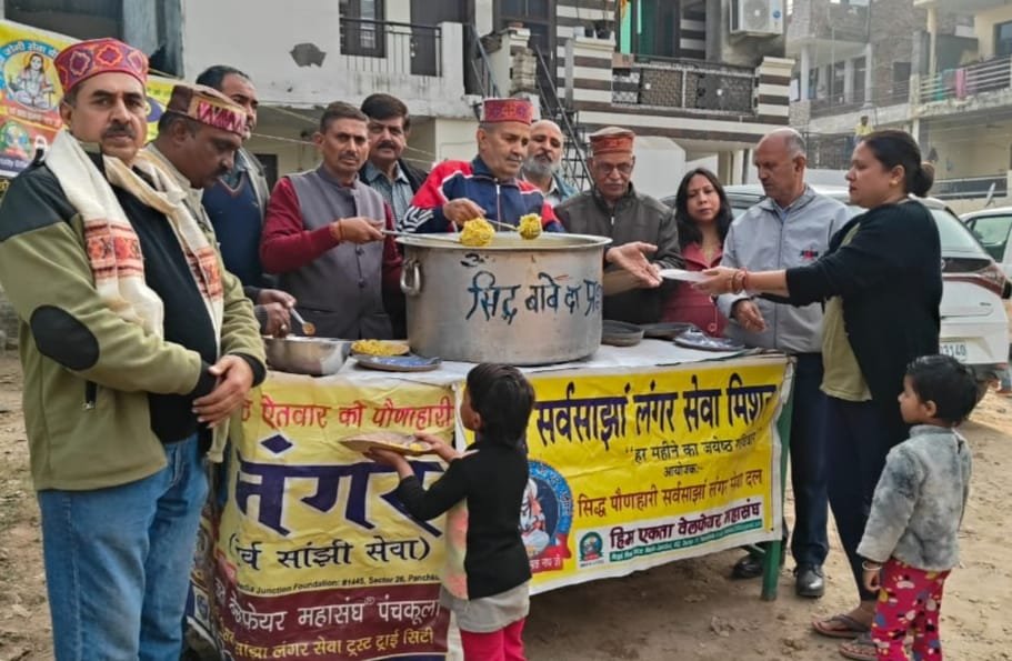 पंचकूला- :-अन्न दान सबसे बड़ा दान ये शास्त्रों में भी वर्णित है । इसी से प्रेरित होकर पंचकूला में हर महीने के ज्येष्ठ रविवार को सिद्ध जोगी सेवा चैरीटेबल ट्रस्ट द्वारा हर महीने के ज्येष्ठ रविवार को सभी श्रद्धालु ने मिलकर बाबे दा प्रशादा का सर्व सांझा लंगर का आयोजन किया गया। ट्रस्ट के प्रमुख अध्यक्ष विक्रांत शर्मा ने बताया कि यह आयोजन ट्रस्ट 26 के मकान नं 1445 की बेकसाइट ट्रस्ट कार्यालय के पास किया जाता है। सिद्ध जोगी सेवा चैरिटेबल ट्रस्ट के सलाहकार एडवोकेट दिनेश चतरथ, प्रदीप मलिक प्रधान ने बताया कि सभी दानी श्रद्धालुओं के सहयोग से ट्रस्ट द्वारा सर्व सांझा लंगर सेवा लगातार जारी है। और पंचकूला में सेक्टर 26 में सर्दी का मौसम के अनुसार ही नमकीन चावल प्लाअ तथा कई किस्म का आचार का भंडारा ज्येष्ठ रविवार दोपहर को लगाया गया। सिद्ध जोगी सेवा चैरीटेबल ट्रस्ट के सेवादार प्रवीण बाली, ऊमेश शर्मा, हरीश शर्मा, बिंदू मलिक, कृष्ण कुमार वरिष्ट, डाक्टर सीमा गुप्ता, सुनिता शर्मा, पूजा , कमल, दीपक , अमित गोयल, पूजा , प्रीति धारा , अमृता गिल ,सीता राम तथा अन्य कई बाबा के श्रद्धालुओं ने इस सर्व सांझा लंगर सेवा मिशन में सेवा की हैं। क्यों कि ये सर्व सांझा लंगर सेवा मिशन सभी के सहयोग से चलता है। प्रवीण बाली ने मौके पर बताया कि आगामी 6मई को भजन उत्सव व विशाल हिमाचली धाम का आयोजन होगा।