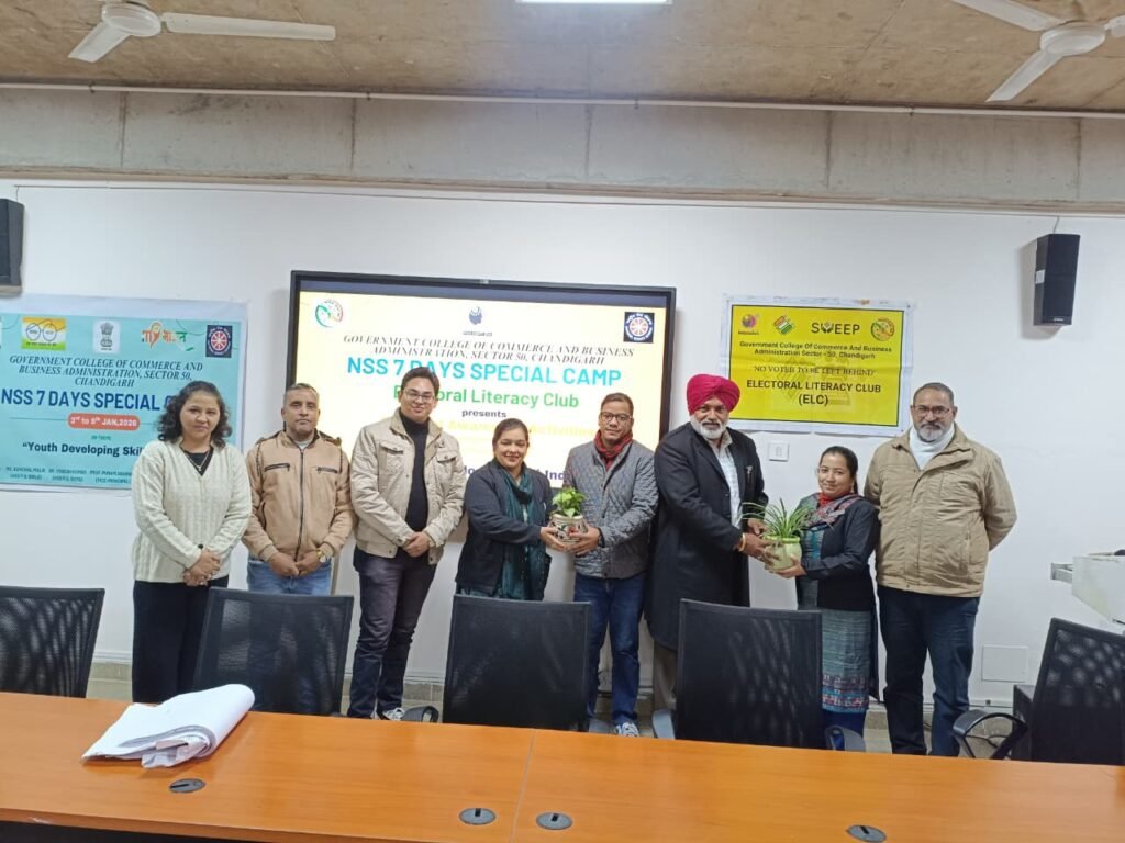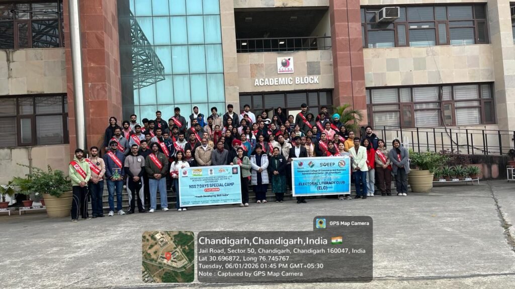 “युवा विकसित कौशल भारत” विषय पर आयोजित विशेष एनएसएस शिविर के चौथे दिन, गवर्नमेंट कॉलेज ऑफ कॉमर्स एंड बिज़नेस एडमिनिस्ट्रेशन (जीसीसीबीए), सेक्टर-50, चंडीगढ़ में एक प्रभावशाली मतदाता जागरूकता अभियान का आयोजन किया गया। यह कार्यक्रम कॉलेज इलेक्टोरल लिटरेसी क्लब (ईएलसी) द्वारा एईआरओ-9, साउथ डिवीजन, चंडीगढ़ के सहयोग से आयोजित किया गया। कार्यक्रम का उद्देश्य युवाओं को निर्वाचन प्रक्रिया, मतदाता अधिकारों एवं कर्तव्यों के प्रति जागरूक कर लोकतांत्रिक सहभागिता को सुदृढ़ बनाना था।