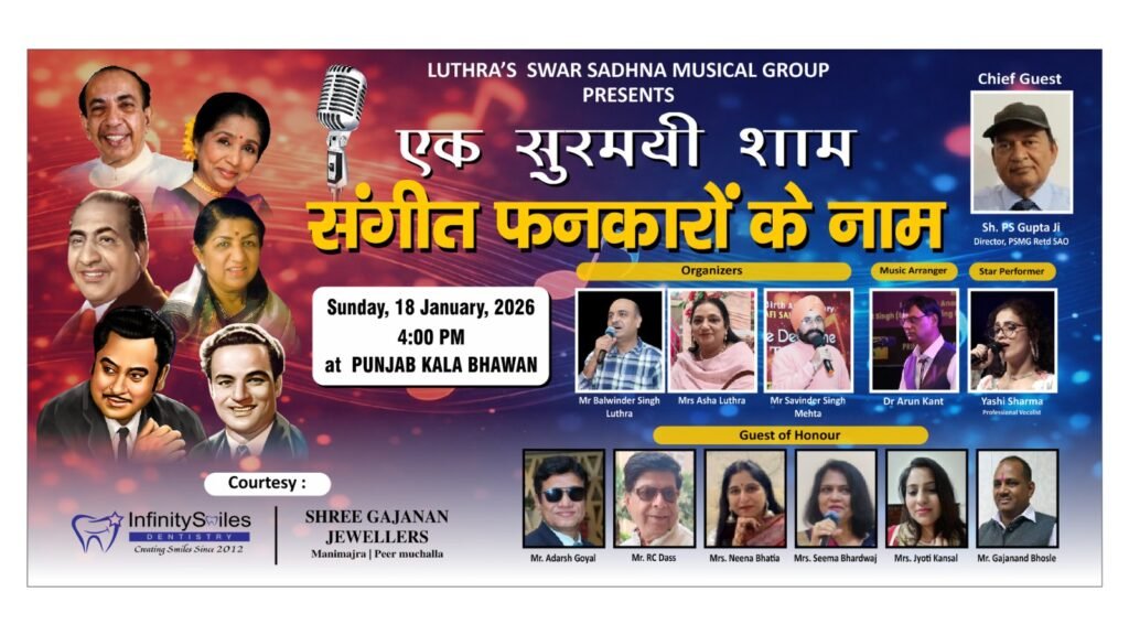 लूथरा’ज़ स्वर साधना म्यूज़िकल ग्रुप द्वारा पुराने हिंदी गीतों पर आधारित कार्यक्रम “एक सुरमयी शाम – संगीत फ़नकारों के नाम” का आयोजन किया जा रहा है। यह कार्यक्रम पंजाब कला भवन, सेक्टर 16, चंडीगढ़ में रविवार, 18 जनवरी को शाम 4 बजे से रात 9 बजे तक आयोजित होगा।