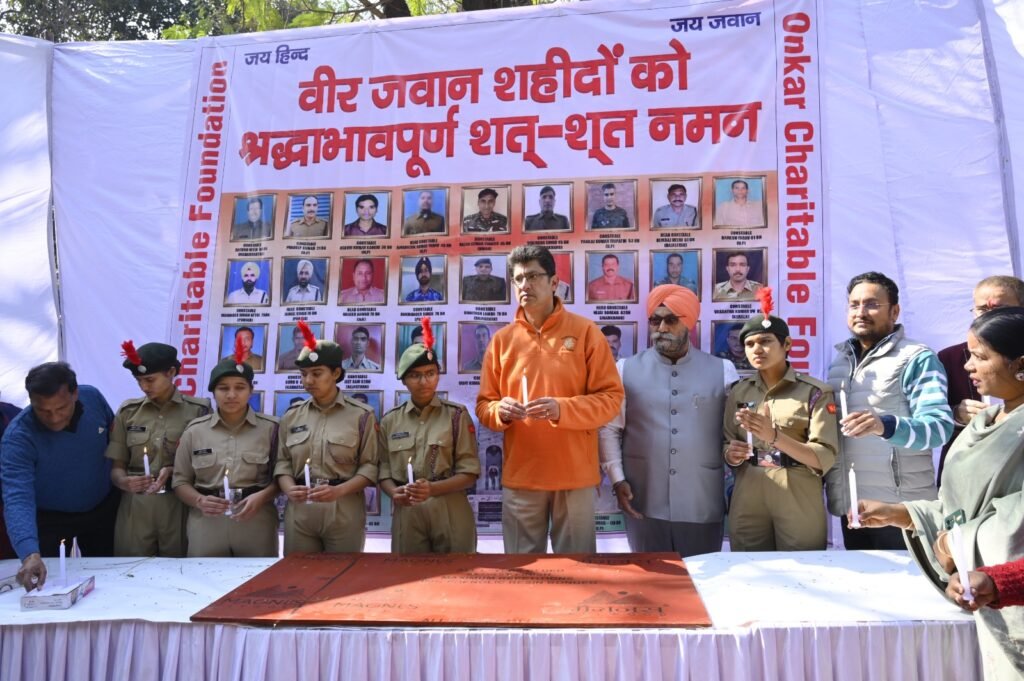ओंकार चैरिटेबल फाउंडेशन और पंजाब यूनिवर्सिटी की एन सी सी गर्ल्स कैडेट्स और मार्किट वेलफेयर एसोसिएशन सेक्टर 24 के आपसी सहयोग से आज वैलेंटाइन दिवस को न मना कर देश के सच्चे सपूतों और देश की आन बान और शान की खातिर अपनी जान न्योछावर करने वाले शहीदों को श्रद्धांजलि अर्पित की गई। इस अवसर पर ए डी जी पी- ए के पांडेय( सी एम सिक्योरिटी पंजाब) और पंजाब यूनिवर्सिटी से एन सी सी गर्ल्स इंचार्ज डॉक्टर श्वेता राणा व सेन्टर फ़ॉर सोशल वर्क की चेयरपर्सन प्रोफेसर मोनिका भी उपस्थित थे। इन सभी और अन्य लोगों के द्वारा शहीदों को नमन कर कैंडल जला कर उन्हें सच्ची श्रद्धांजलि दी गई। इस मौके पर पहलगाम आतंकी हमले में मारे गए बेकसूर और निहत्थे लोगों को भी भावभीनी श्रद्धांजलि दी गई।