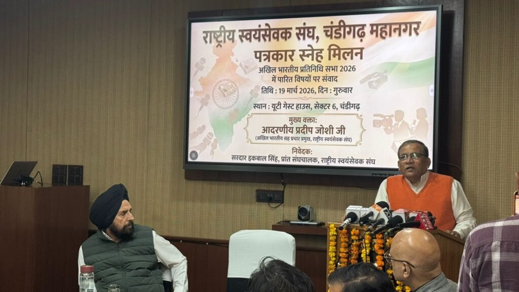 चंडीगढ़। चंडीगढ़ में आयोजित पत्रकार वार्ता के दौरान राष्ट्रीय स्वयंसेवक संघ के सह प्रचार प्रमुख प्रदीप जोशी ने संघ प्रतिनिधि सभा से जुड़े विषयों एवं पंजाब में चल रहे सामाजिक कार्यों को लेकर विस्तार से जानकारी दी। उन्होंने बताया कि आरआरएस राज्य में 145 से अधिक गैर-सरकारी संगठनों (एनजीओ) के साथ मिलकर नशा विरोधी अभियान को मजबूती से आगे बढ़ा रहा है।