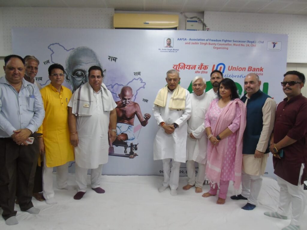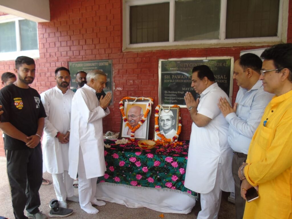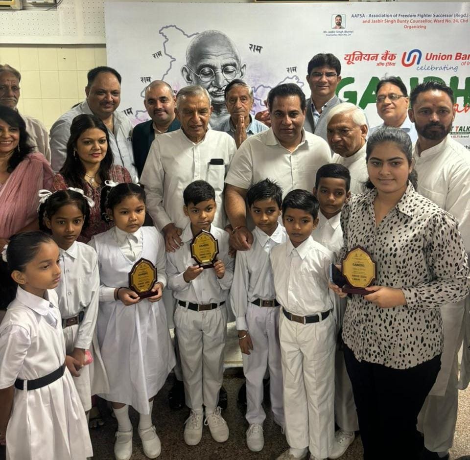 चंडीगढ़:-राष्ट्रपिता महात्मा गांधी व देश के दूसरे प्रधानमंत्री लाल बहादुर शास्त्री की जयंती शहर भर में धूमधाम से मनायी गई। इसी कड़ी में सेक्टर 42 स्थित कम्युनिटी सेन्टर में आफसा और एरिया पार्षद जसबीर बंटी की अध्यक्षता में यूनियन बैंक ऑफ इंडिया के सहयोग से गांधी शास्त्री जयंती पर एक विशेष कार्यक्रम का आयोजन किया गया। यूनियन बैंक ऑफ इंडिया के डिप्टी जनरल मैनेजर रजनीश रोहिल्ला मुख्य अतिथि थे।जबकि इस मौके पूर्व केंद्रीय मंत्री व पूर्व चंडीगढ़ सांसद पवन कुमार बंसल, चंडीगढ़ कांग्रेस कमेटी के अध्यक्ष हरमोहिंदर सिंह लकी भी विशिष्ट अतिथि के रूप में उपस्थित हुए। सभी उपस्थितगण ने राष्ट्रपिता महात्मा गांधी व लाल बहादुर शास्त्री जी की फोटो पर माल्यार्पण और पुष्पांजलि अर्पित की। बजिंदर सिंह चौहान, डॉ. अश्वनी शांडिल्य, विख्यात लेखक घनश्याम देव और श्रीमती सीमा गुप्ता द्वारा महात्मा गांधी जी पर कविताओं और भजन व आज के संदर्भ में गांधी जी की विचारधारा जैसे विषयों पर कई कार्यक्रमों का आयोजन करके उन्हें श्रद्धांजलि अर्पित की। इस अवसर पर एसोसिएशन ऑफ फ्रीडम फाइटर सक्सेसर (पंजीकृत) के सदस्य और एमसी वार्ड नंबर 24 के सफाई मित्र और एनजीओ ओंकार चैरिटेबल फाउंडेशन के चेयरमैन रविंदर सिंह बिल्ला को टीम सॉल्यूशंस, जसबीर सिंह बंटी और मुख्य अतिथि रजनीश रोहिल्ला द्वारा मोमेंटो और शॉल देकर सम्मानित किया गया।